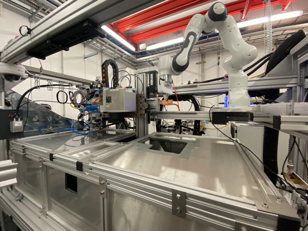 Neben einem größeren Arbeitsbereich ergänzt eine Bleiumhausung den neuen Versuchsaufbau. Diese wird eingesetzt, um die hochenergetische Primär- und Sekundärstrahlung, die im Prozess entsteht, abzuschirmen und dadurch unsere Elektronik und Sensorik nicht zu beschädigen. Neben einer möglichen Scannerbewegung, wird die Relativbewegung wie beim alten Aufbau wieder über eine Hochgeschwindigkeitsachse realisiert.