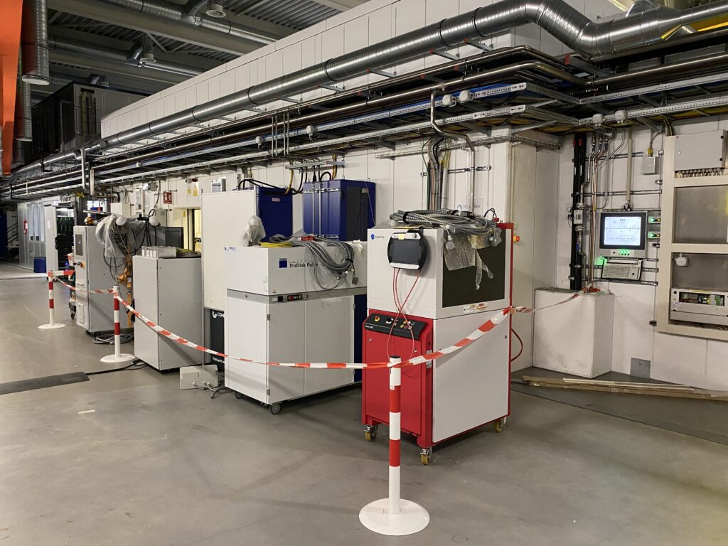 Durch den Einsatz unterschiedlicher optischer Systeme sowie den Einsatz von Laser verschiedener Wellenlängen bietet unsere modulare Anlage die Möglichkeit eine Vielzahl von verschiedenen Anwendungen abzubilden. Insbesondere wurden bisher verschiedene Stähle, Kupfer- und Aluminiumlegierungen unter Einsatz von Laserstrahlquellen im sichtbaren und nahinfraroten Wellenlängenbereich eingesetzt. Im folgenden Bild sieht man einen Bruchteil der Systemtechnik und Laserstrahlquellen, die vor der Beamline aufgestellt werden. Die Laserstrahlung sowie Steuerleitungen werden über eine Labyrinthführung in die Experimentierhütte geleitet.